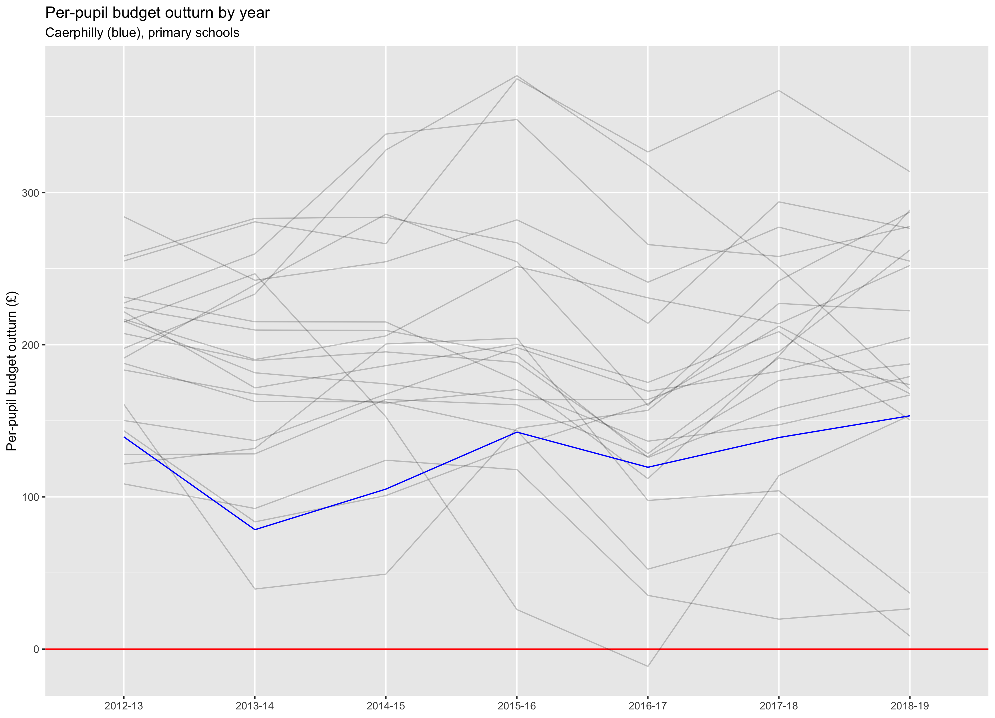 Caerphilly's primary school sector's reserves have remained relatively stable over the last few years. Their average per pupil reserves are £153.32 which ranks 18th in Wales. In 2018-19, 11 primary schools ended the year with deficits.