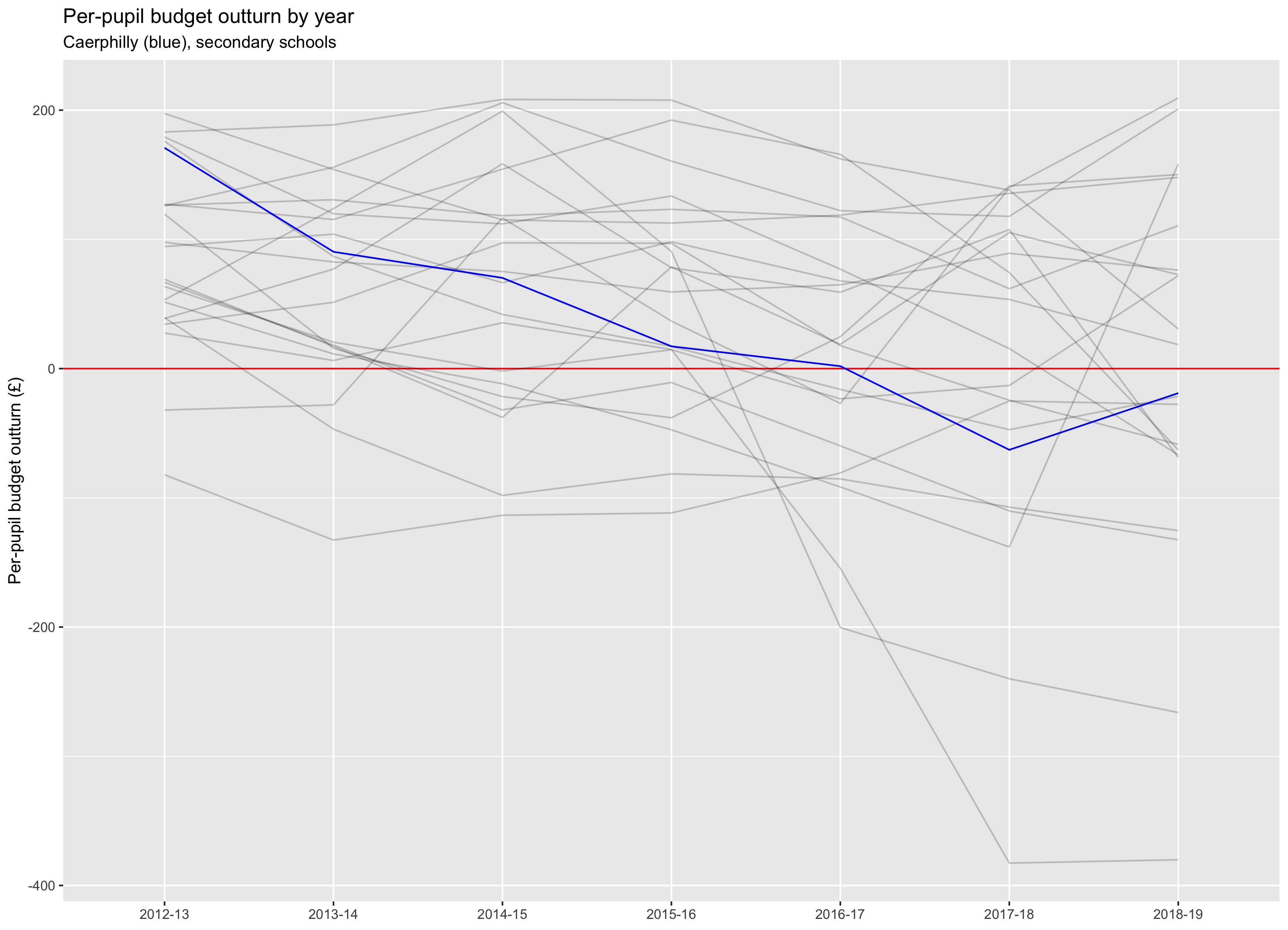Caerphilly's secondary schools per pupil average has recently gone from a slight surplus to a slight deficit ending 2018-19 at -£19 per pupil (12th in Wales). Six out of 11 secondary schools are in deficit.