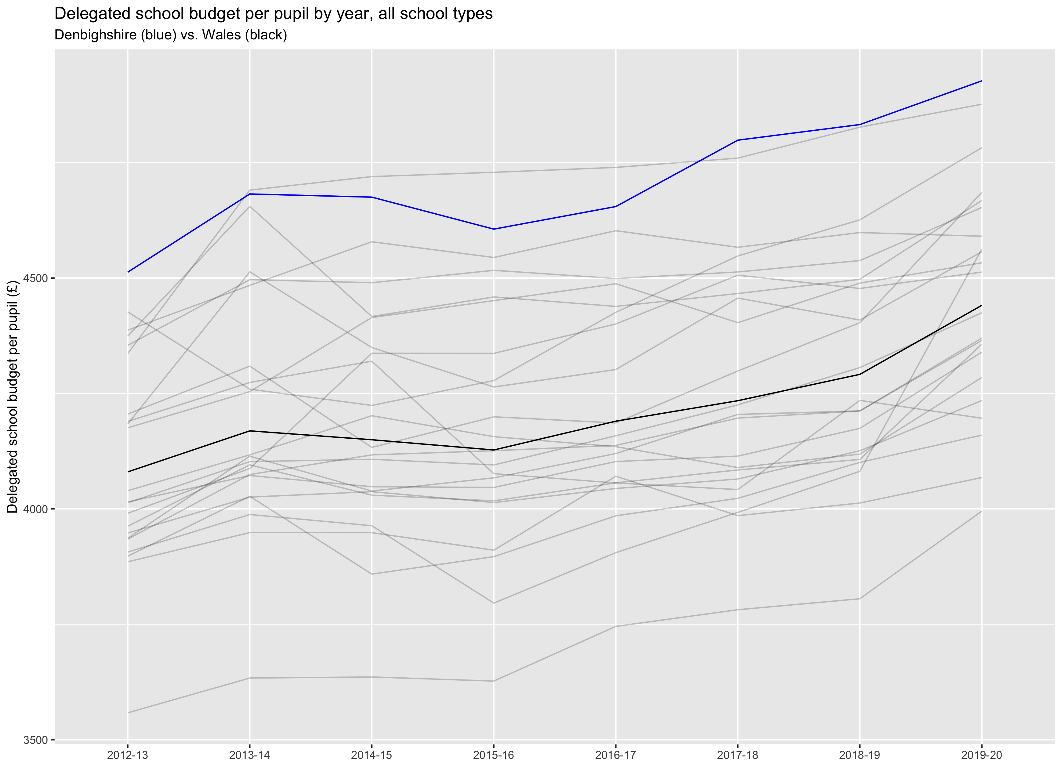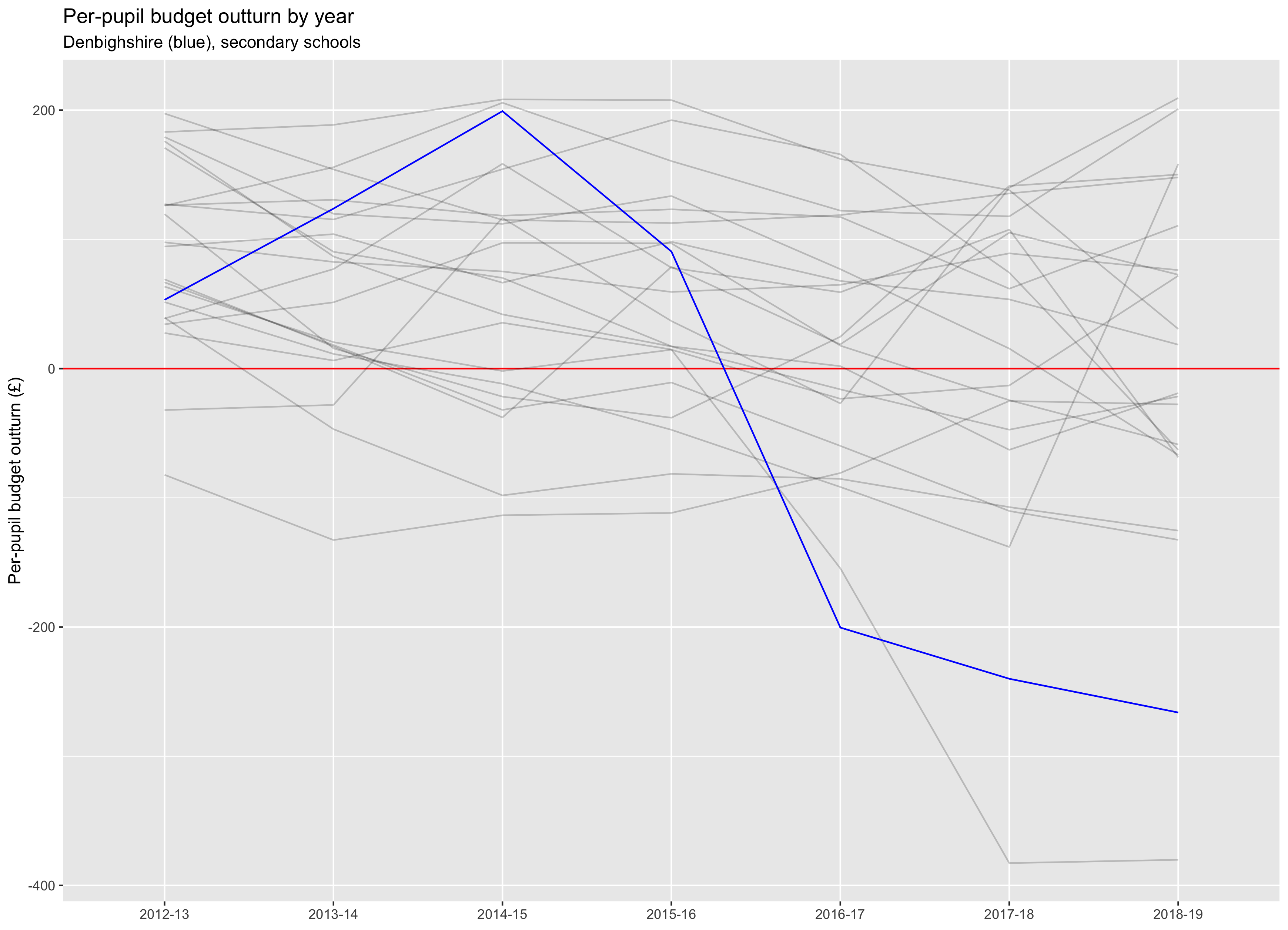 Denbighshire's one through school for 2018–19 has had a deficit for three years, with a per pupil average in the last year of -£628 which is the worst for the ten local authorities which have this type of school.
