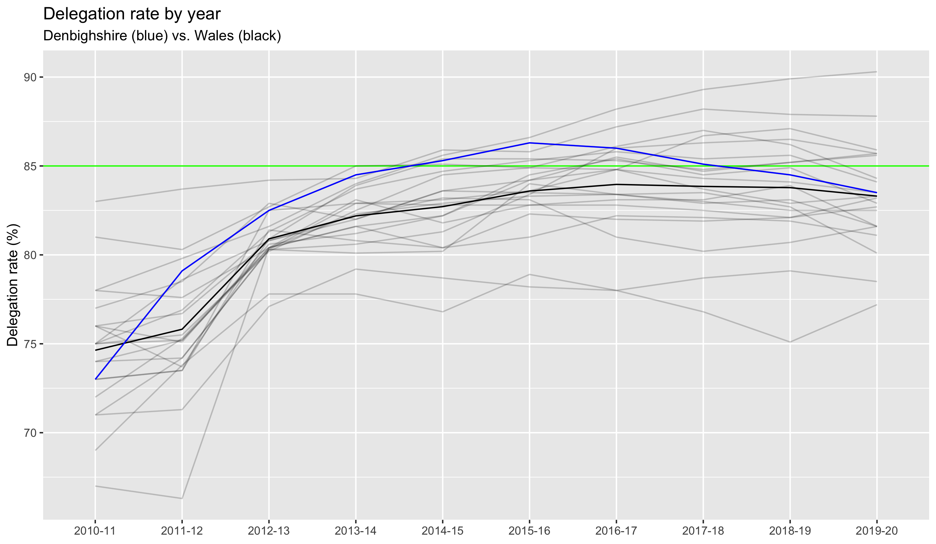 Rate of delegation in Denbighshire in 2020–21 = 85.4% (2019–20 = 83.5%) 6th highest in Wales, compred to =9th highest in Wales