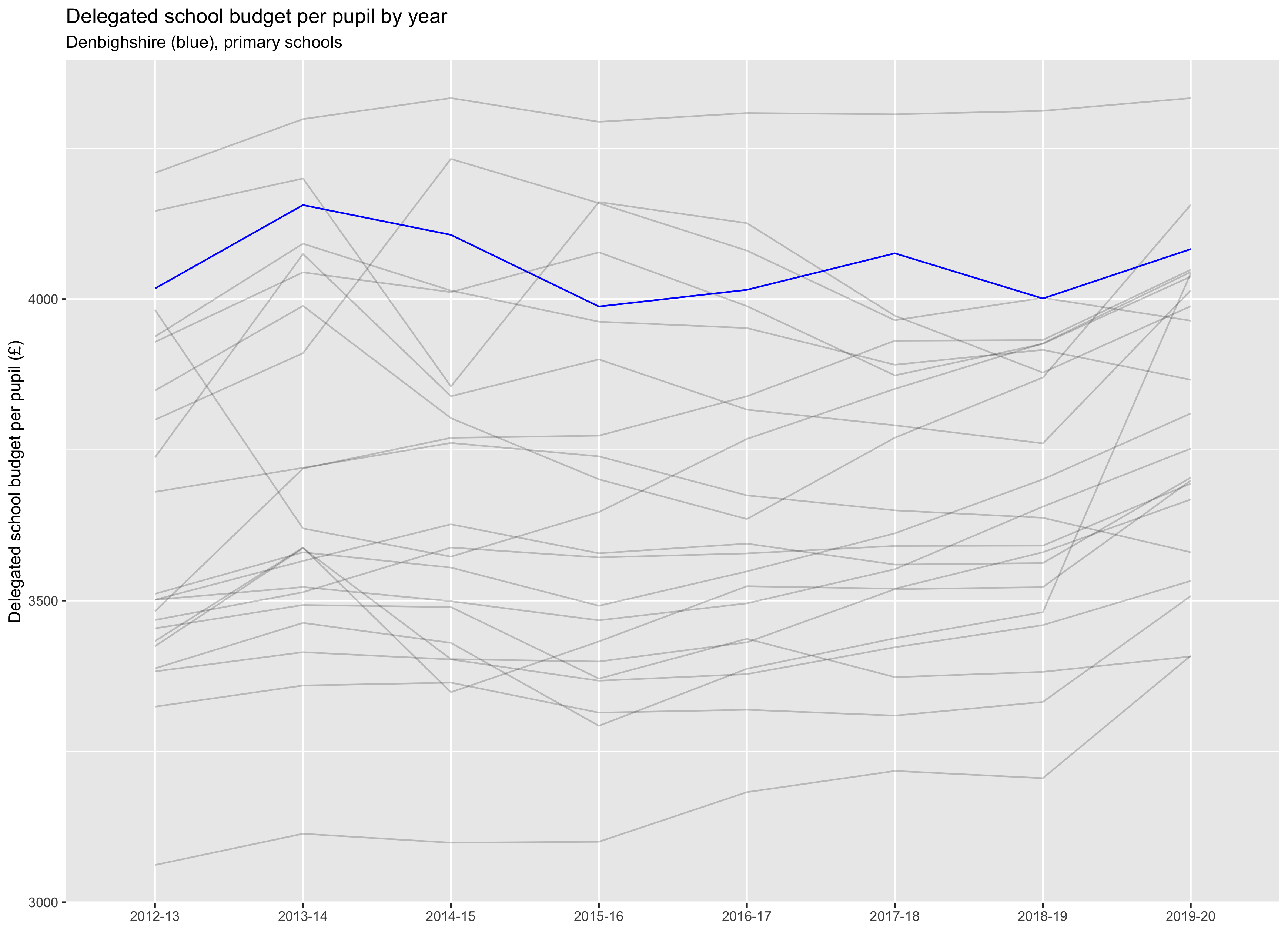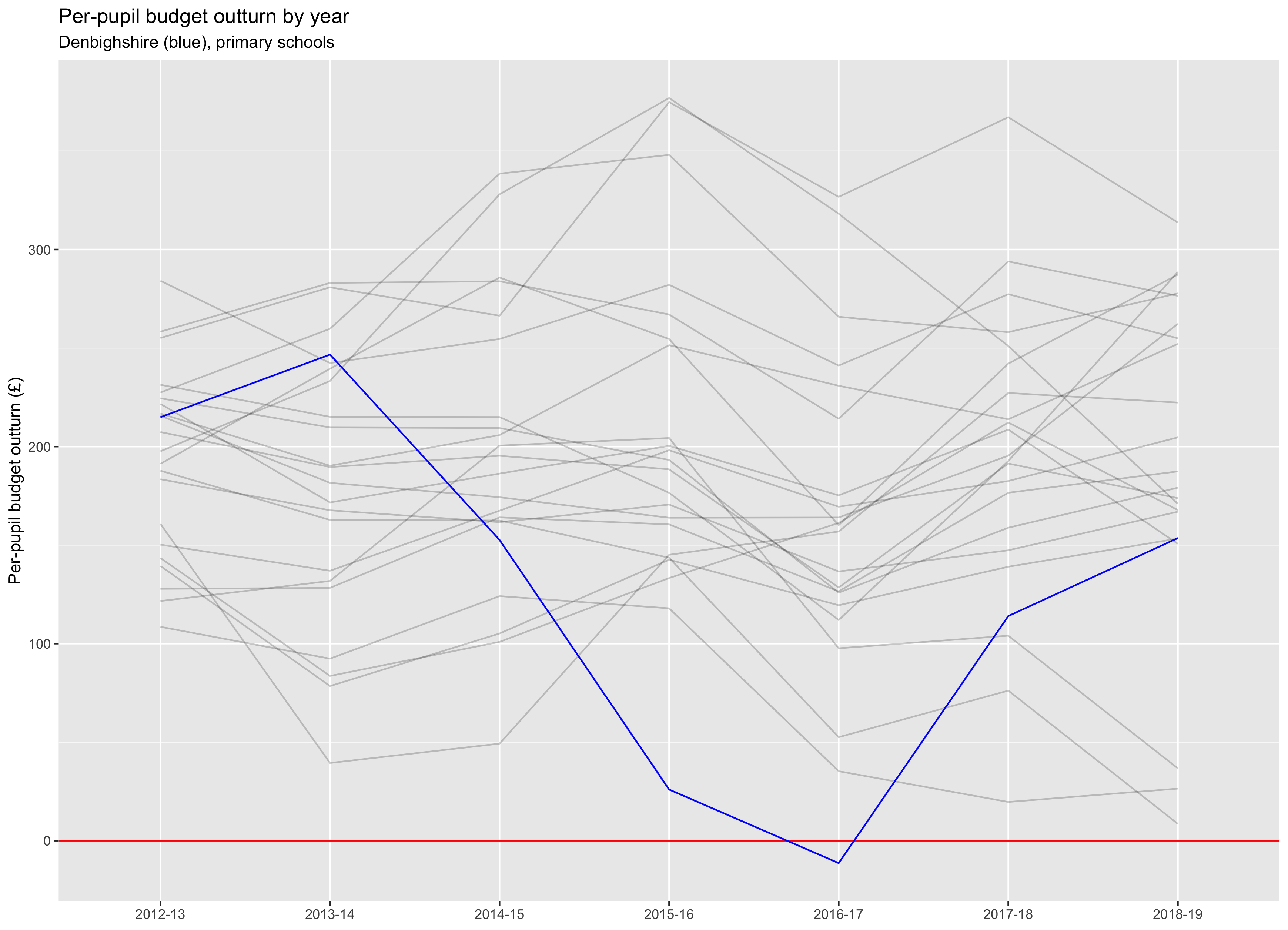 Denbighshire's primary school reserves have on average improved in the last few years and the sector now has a per pupil surplus of £153.58—17th in Wales. Seven of its 45 primary schools ended 2018–19 in deficit.