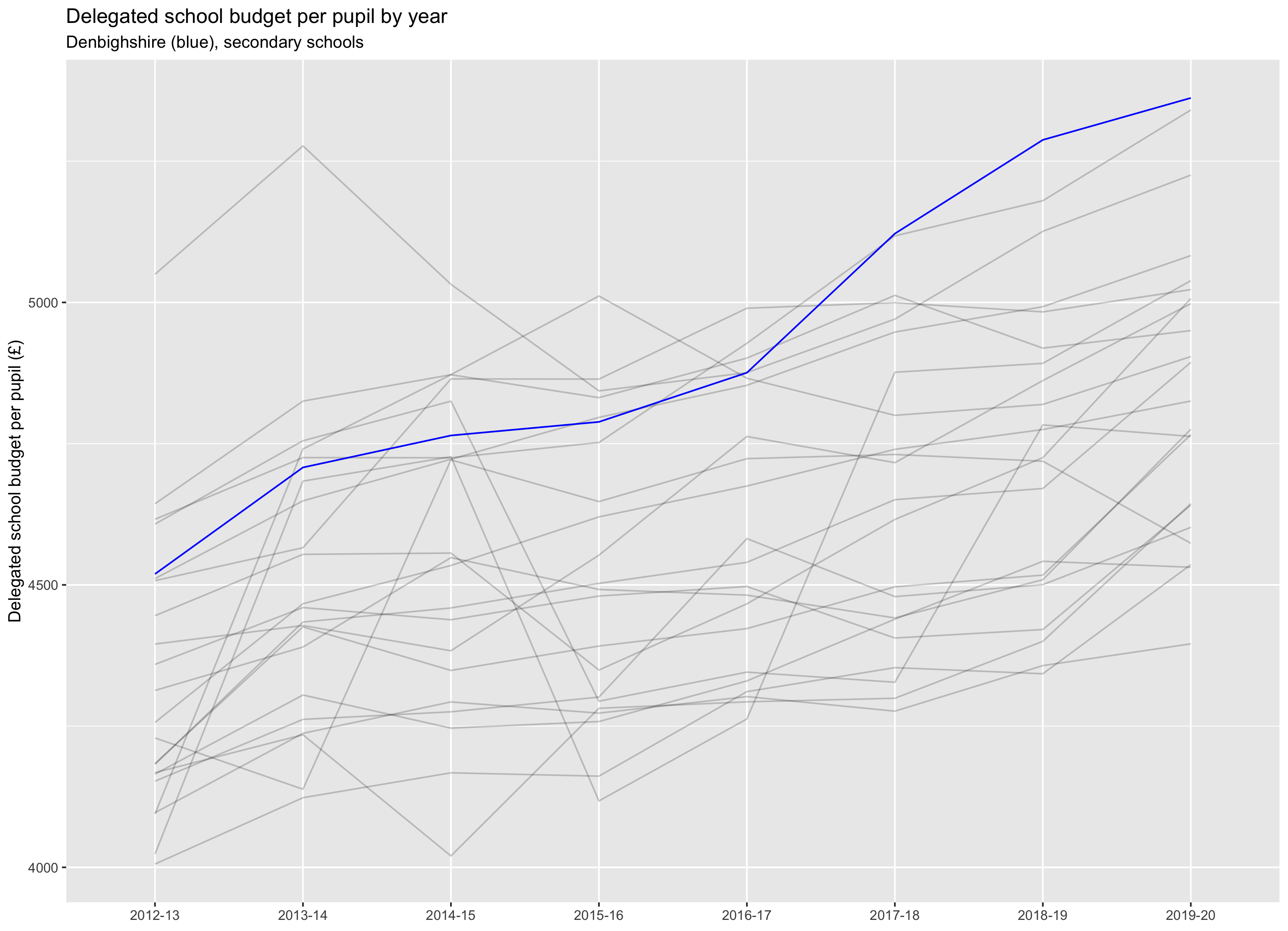 By contrast with the primary schools, Denbighshire's secondary school sector has suffered dramatically deteriorating finances. Denbighshire has a per pupil deficit of -£266.58 and only two of its seven secondary schools are in surplus—this places them in 21st place. Denbighshire has the second largest gap between the overall reserves in its primary and secondary school sectors (a gap of £420.16 per pupil).