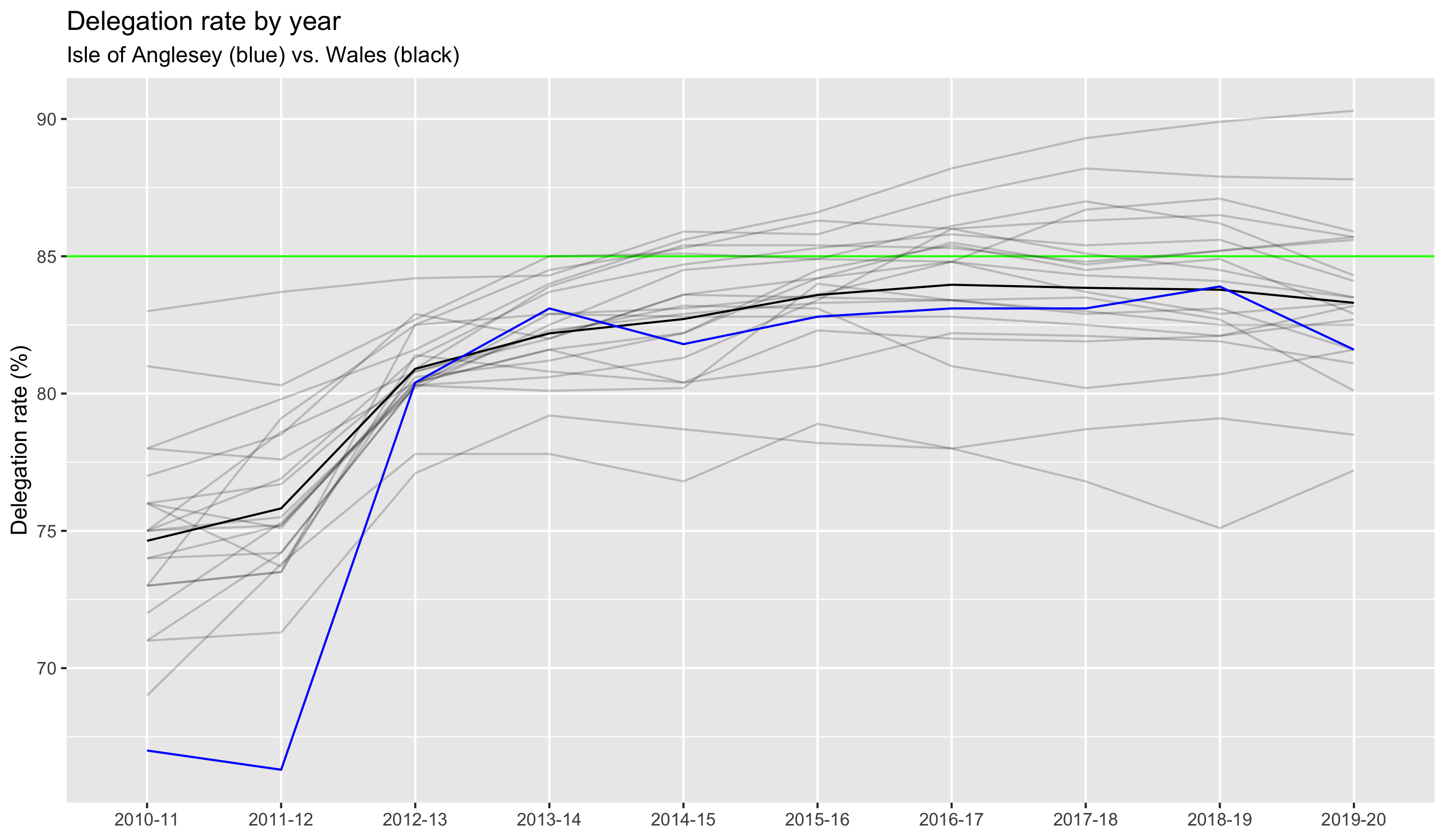 Rate of delegation in Isle of Anglesey in 2020–21 = 82% (2019–20 = 81.6%) 16th highest in Wales, no change from previous year