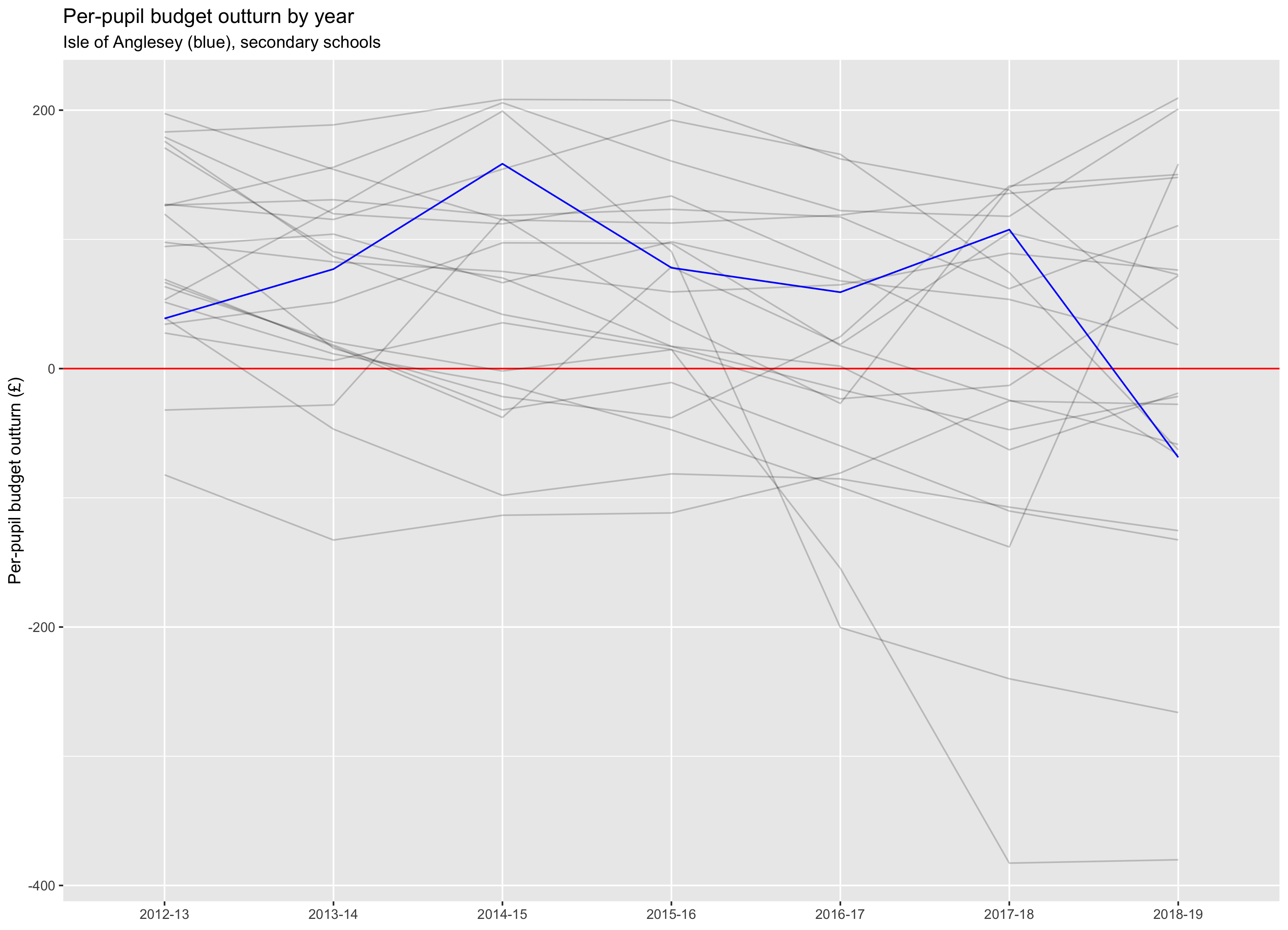 Isle of Anglesey's secondary school sector has gone into deficit from surplus and the average per pupil is -£69.54 (18th in Wales). At the end of 2018–19, three out of five secondary schools were in deficit.