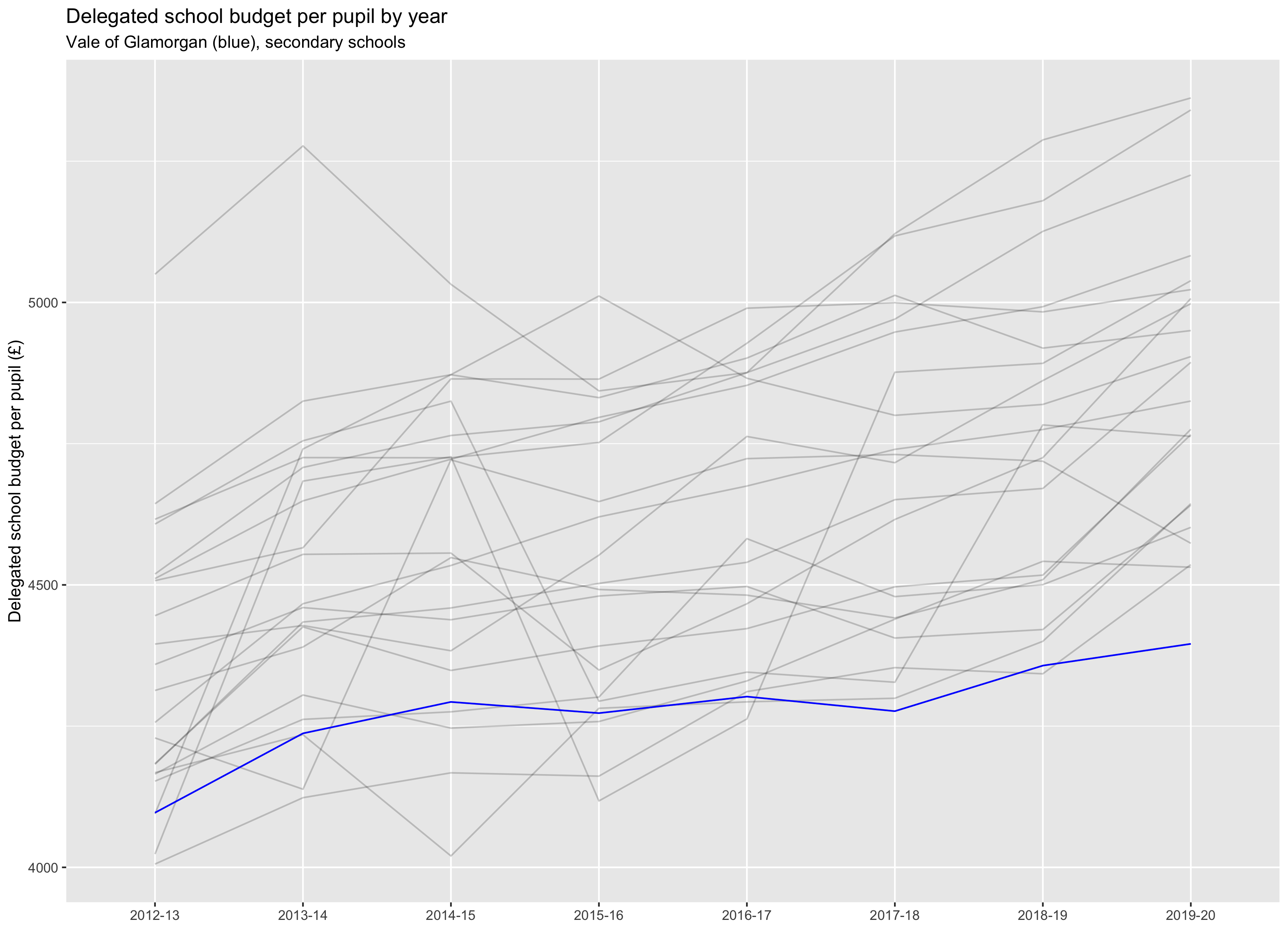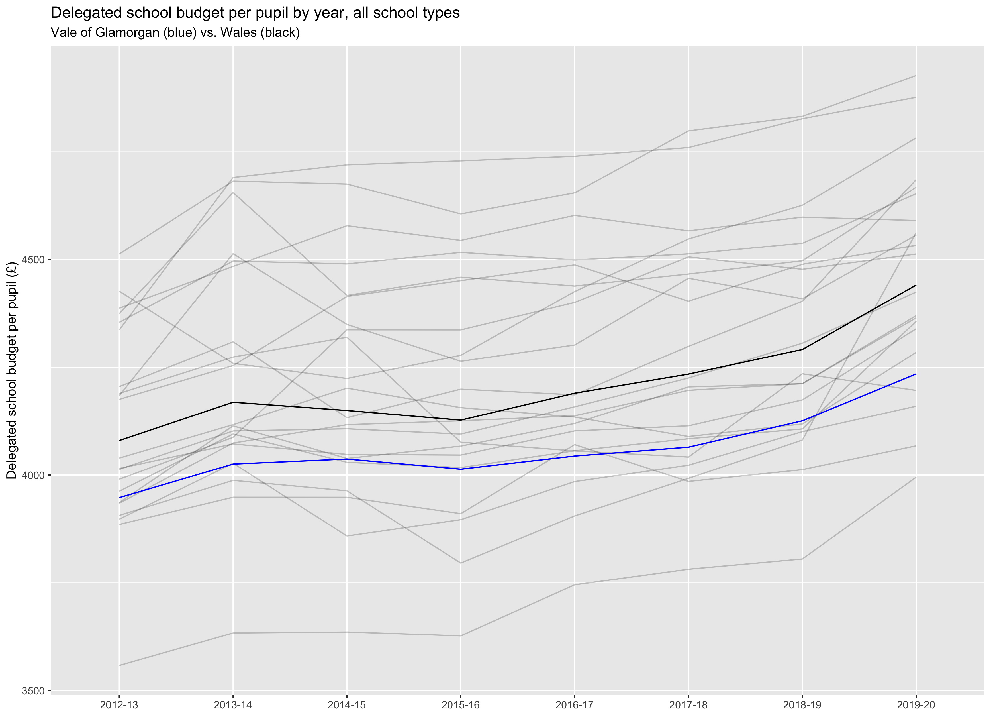 Ranked 22nd (lowest) for funding per pupil from Welsh Government for schools budgets, no change.
